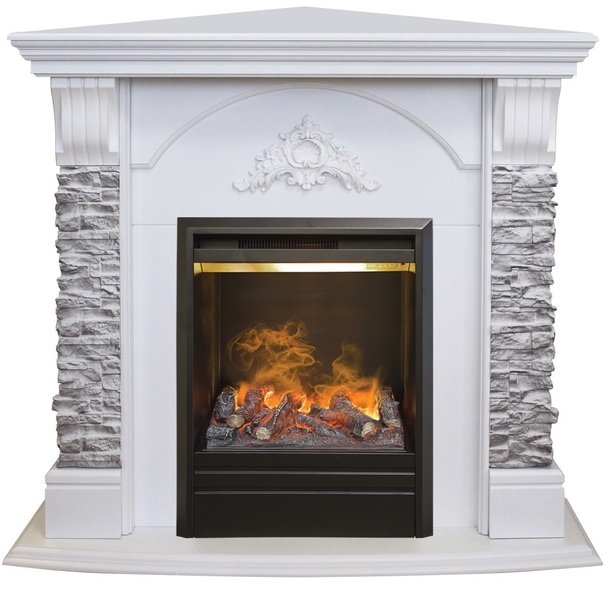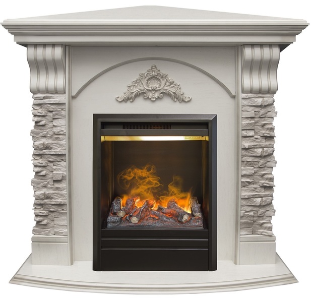 Угловой каминокомплект Real Flame Athena GR с очагом 3D Olympic - сочетание для истинных ценителей эффектных решений. Здесь речь идет о сочетании стилей - кантри и классики. На деревянные элементы (шпонированный МДФ) нанесён резной классический узор в верхней центральной части камина, по бокам расположены две параллельные колонны, выполненные из искусственного камня серого оттенка неровной хаотичной кладки. В целом композиция смотрится гармоничной и нарядной. Нарядность образу придают легкие освежающие цвета и оттенки: серый ("камень"), белый или белый дуб ("дерево"). Угловой камин серии Athena GR также представлен прямой конфигурацией (подробно см: Электрокамин (очаг+портал) Real Flame Athena GR с очагом 3D Olympic). Стоит отметить преимущества самого очага 3D Olympic. Это очаг с потрясающим 3D эффектом пламени и реалистичным муляжом прогоревших дров, с функцией увлажнения воздуха. Он поможет создать комфортную, тёплую, уютную атмосферу в Вашем доме. Надёжная конструкция очага позволит наслаждаться данной моделью на протяжении многих лет.